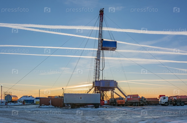 Промышленный зимний пейзаж с работающей буровой установкой и вспомогательными помещениями на удаленной рабочей площадке в светлое время суток