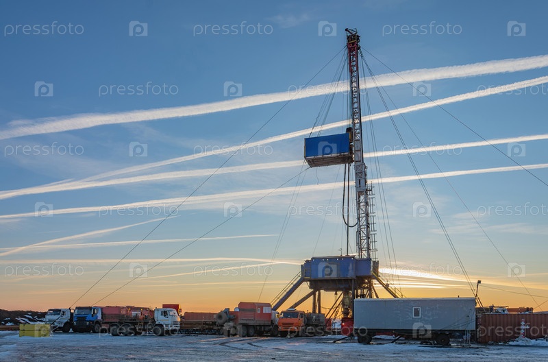Промышленный зимний пейзаж с работающей буровой установкой и вспомогательными помещениями на удаленной рабочей площадке в светлое время суток