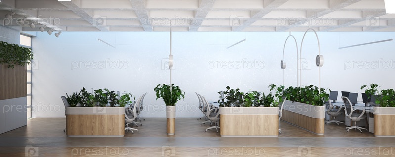 Элегантное современное офисное пространство с естественным освещением и зеленью. 3D-рендеринг