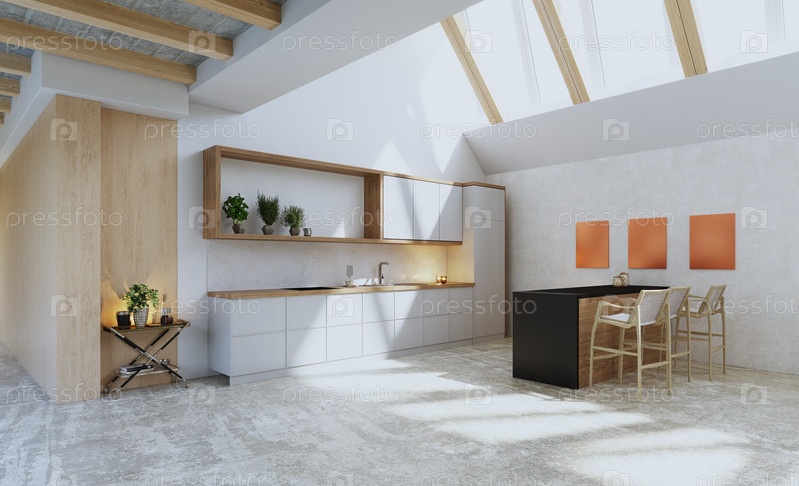 Современная открытая кухня с естественным светом, проникающим через большие окна. 3D-рендеринг