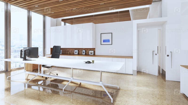 Современный офис руководителя с большими окнами и минималистичным дизайном. 3D-рендеринг