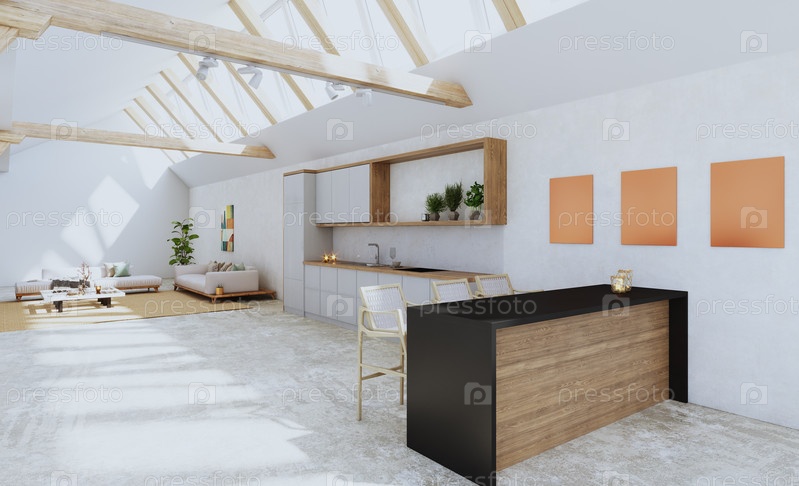 Современная открытая кухня с естественным светом, проникающим через большие окна. 3D-рендеринг