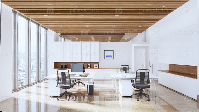 Просторный современный офис с большими окнами и элегантной мебелью. 3D-рендеринг