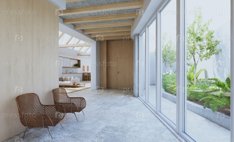 Современная гостиная с большими окнами