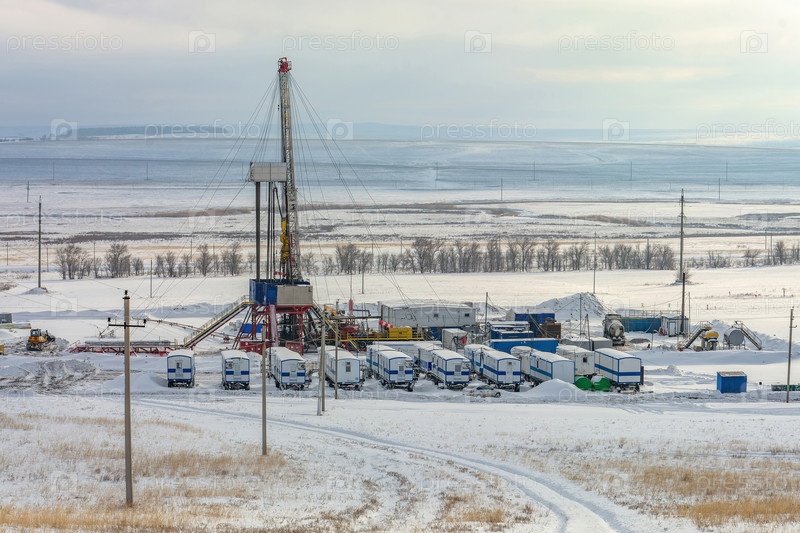 Обширный зимний вид на комплекс промышленных буровых установок на фоне заснеженной равнины, где расположены жилые помещения для персонала и эксплуатационное оборудование