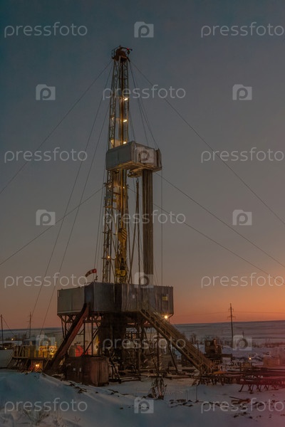 Промышленная буровая установка, вырисовывающаяся на фоне темного зимнего неба, с заснеженной землей и лагерными сооружениями, видимыми в угасающих сумерках