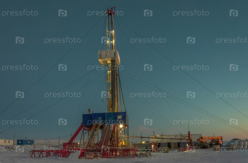 Промышленная буровая установка, вырисовывающаяся на фоне темного зимнего неба, с заснеженной землей и лагерными сооружениями, видимыми в угасающих сумерках