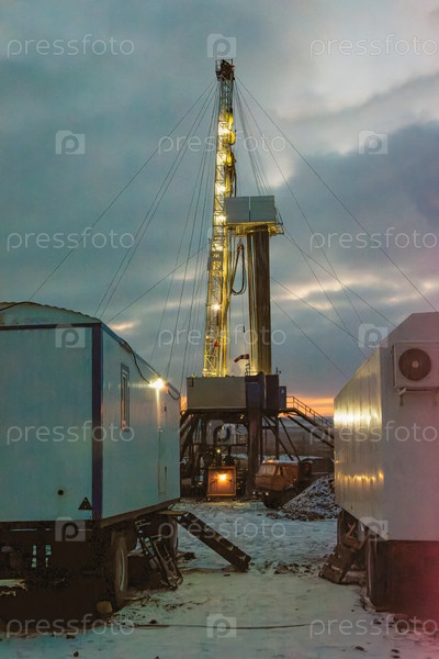 Промышленная буровая установка, вырисовывающаяся на фоне темного зимнего неба, с заснеженной землей и лагерными сооружениями, видимыми в угасающих сумерках