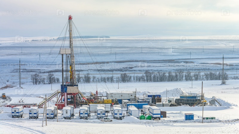 Обширный зимний вид на комплекс промышленных буровых установок на фоне заснеженной равнины, где расположены жилые помещения для персонала и эксплуатационное оборудование