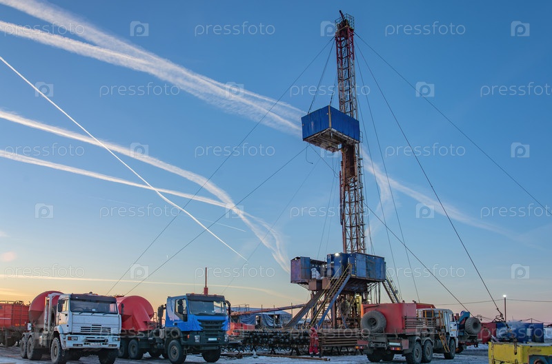 Промышленный зимний пейзаж с работающей буровой установкой и вспомогательными помещениями на удаленной рабочей площадке в светлое время суток