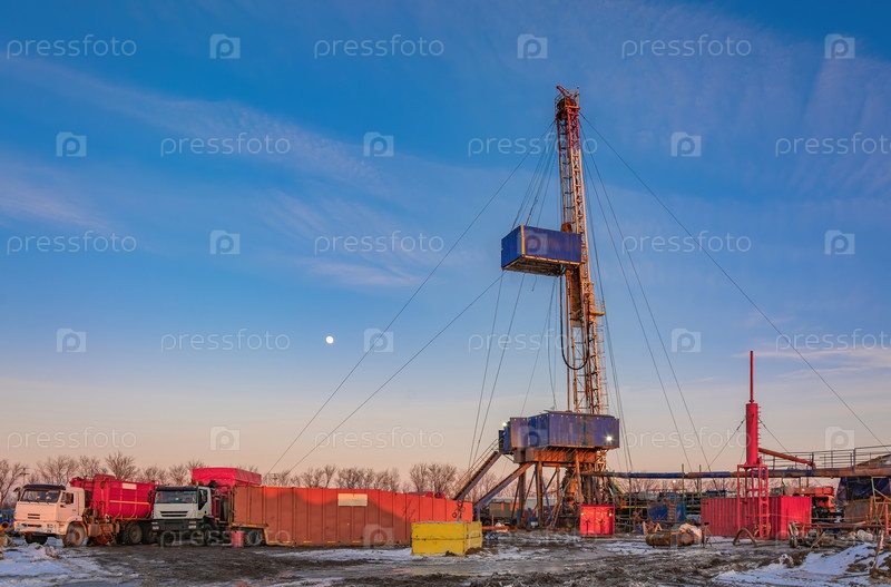 Промышленный зимний пейзаж с работающей буровой установкой и вспомогательными помещениями на удаленной рабочей площадке в светлое время суток