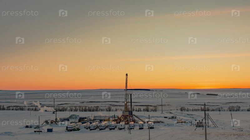 Обширный зимний вид на комплекс промышленных буровых установок на фоне заснеженной равнины, где расположены жилые помещения для персонала и эксплуатационное оборудование