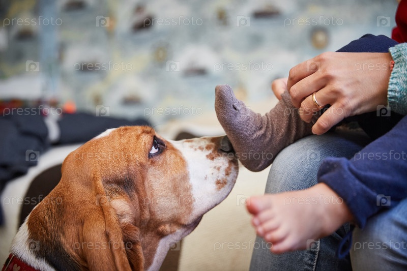 Преданная собака обнюхивает ногу ребенка и руку матери