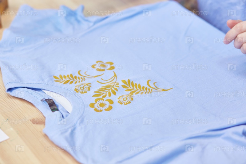 Рисунок на синей футболке. Ручная печать акриловыми красками