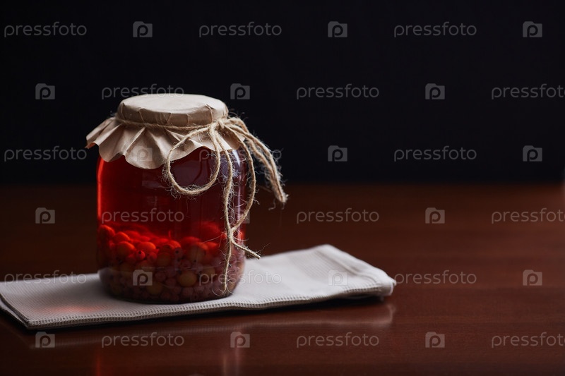 Запеченный крестонос и смородина в стеклянной банке. Темный деревянный стол с фоном. copyspace