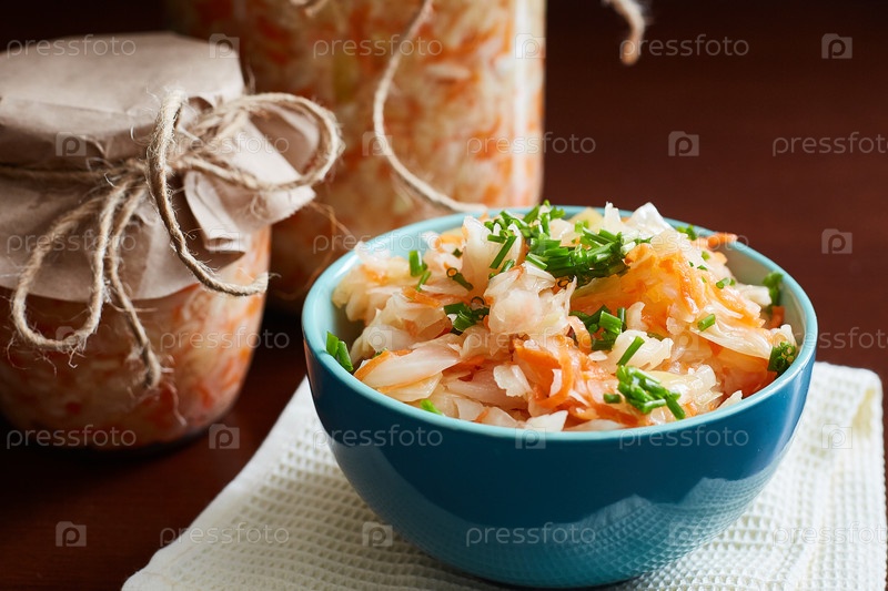 Квашеная капуста с морковью в большой синей миске. ферментация овощей