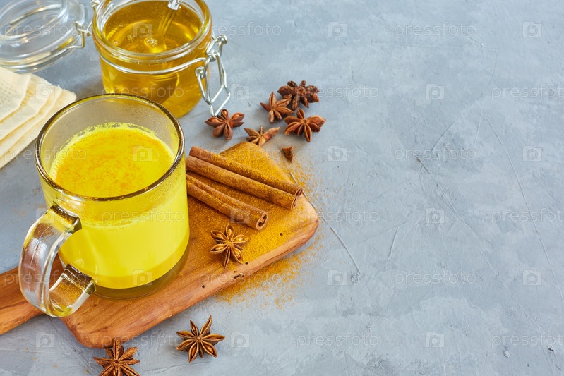 Золотое молоко в прозрачной стеклянной чашке. Куркумин, анис, корица. защита от covid-19. концепция здоровья и долголетия