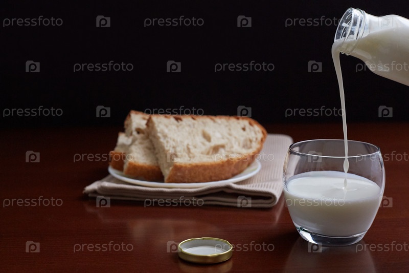 Кефир из бутылки течет в стакан. Хлеб на заднем плане. Темный фон и коричневый деревянный стол