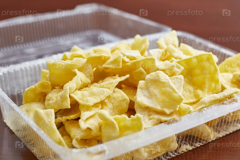 Традиционное турецкое блюдо. Восточные сладости из хвороста лежат в пластиковом контейнере. Крупный план