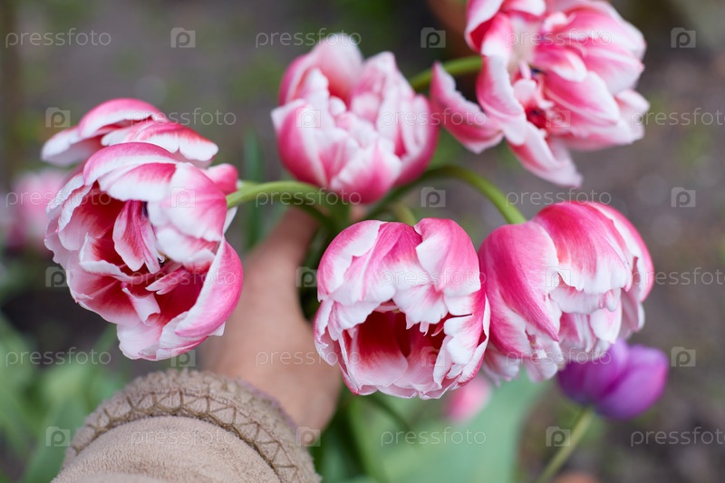 Белые и розовые сортовые тюльпаны в руке. Крупный план