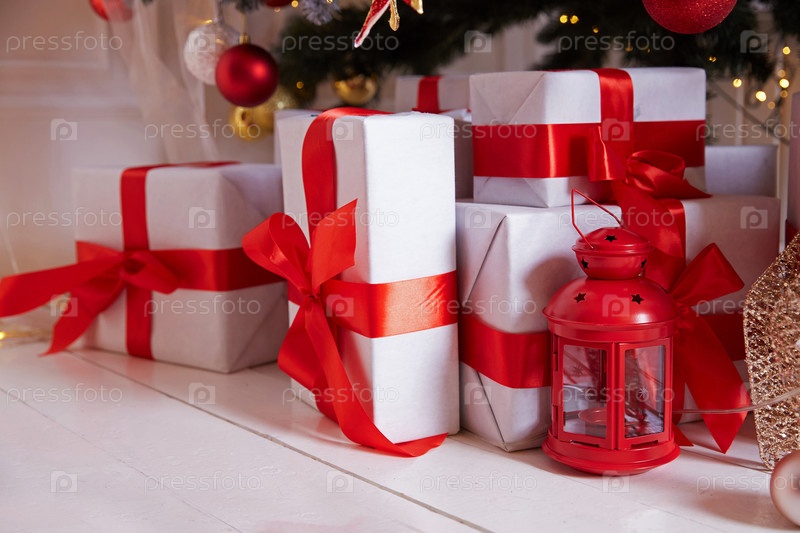 Подарки под елкой в белых коробках, перевязанные красной лентой