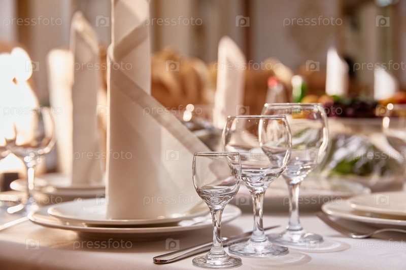 Праздничный накрытый стол со столовыми приборами, красивыми бокалами и салфеткой в ресторане. Крупным планом. Копировать пространство