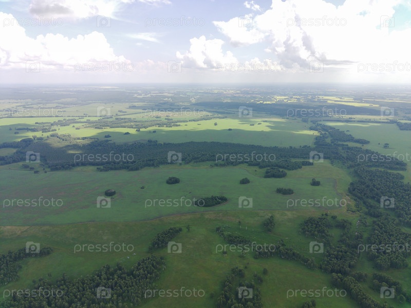 Съемка из квадрокоптера. Поля, луга и лесные окопы, лето. Россия, Сибирь, Новосибирская область. Quadrotor filming. Fields, meadows and forest edges, summer. Russia, Siberia, Novosibirsk region. Фотография с азиатского взгляда。 田野, пастбища и края леса, л