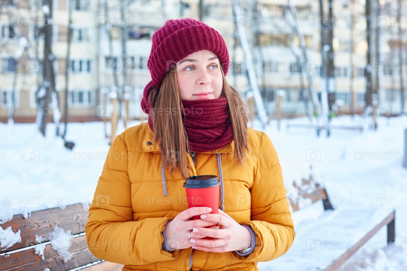 Молодая женщина в шляпе-бенни и желтой куртке с одноразовым стаканчиком кофе в руках в морозный зимний день