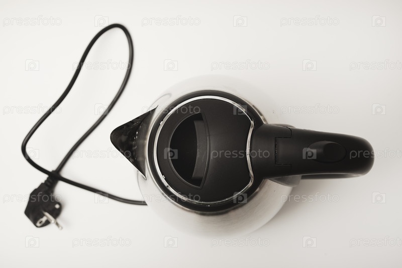 Электрический чайник на белом фоне. Металлический чайник с черной ручкой