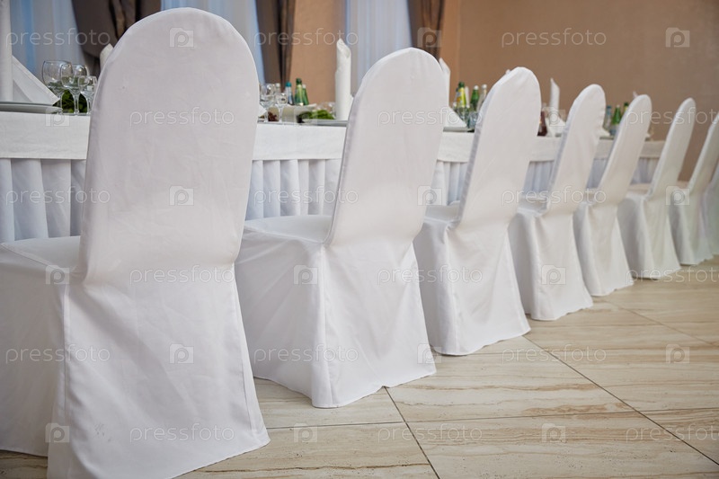 Стулья в белых чехлах в ресторане возле накрытого стола. Свадьба