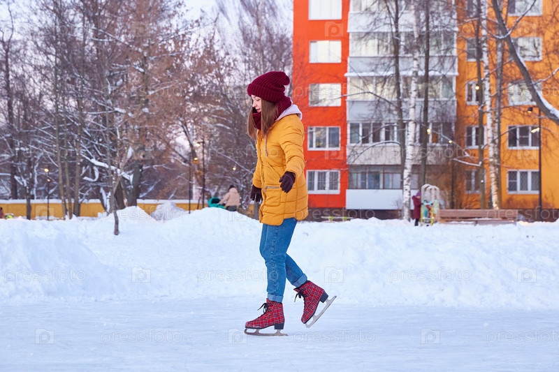 Женщина катается на коньках зимой возле разноцветных домов в городе