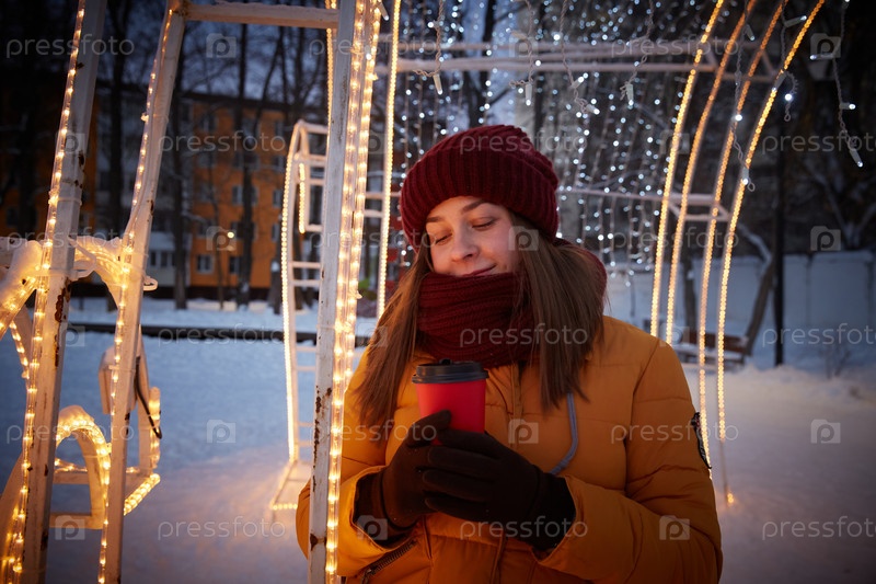 Вечерняя прогулка молодой женщины по украшенному зимнему городу