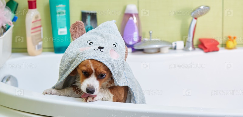 Очень милая собака, метис рыжий с белым, принимает ванну