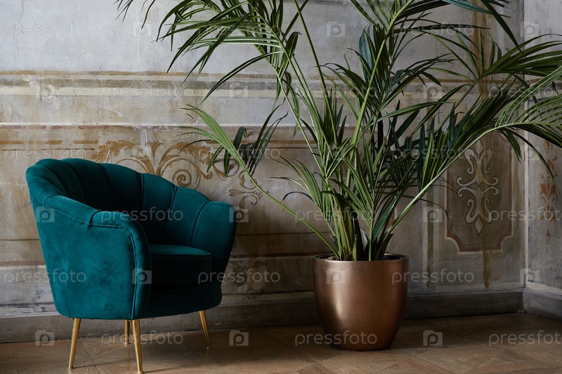 Зеленое кресло рядом с большим цветком. Интерьер загородного дома. Концепция простого проживания. Уютная квартира со старой модной мебелью и ретро-дизайном в комнате