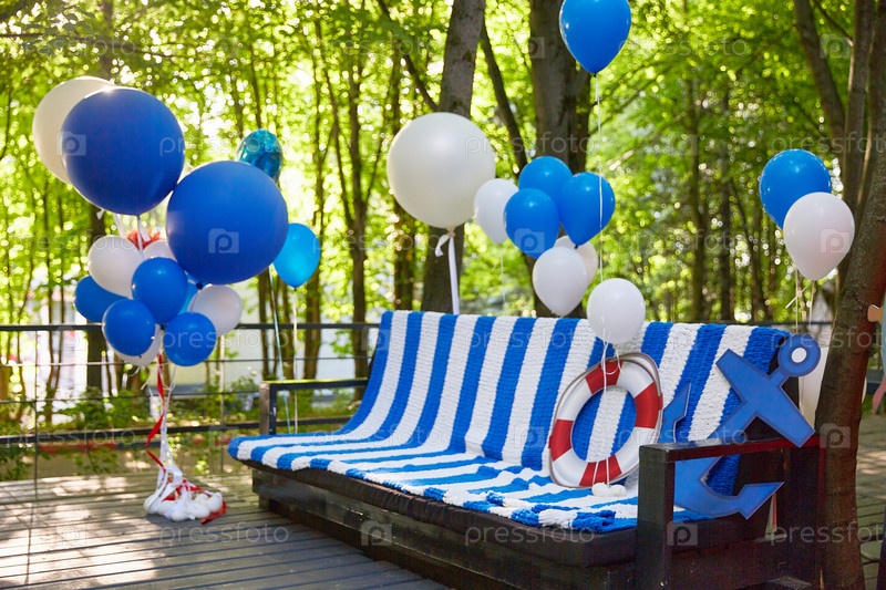 Фотозона с сине-белыми шарами и диваном в морском стиле. Солнечный летний день