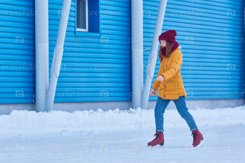 Женщина в желтой куртке катается на коньках на фоне синего спортивного здания