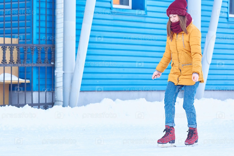 Девочка катается на коньках зимой на льду возле спортивного сооружения