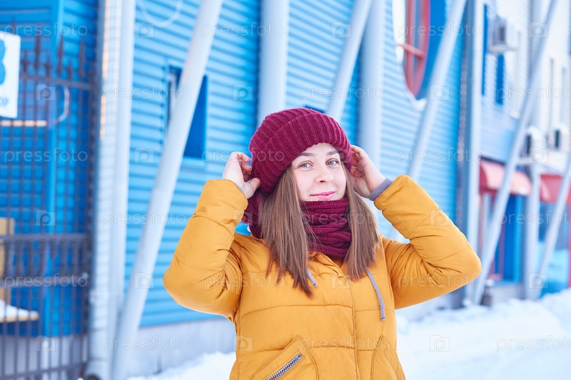 Молодая женщина в яркой одежде выходит на улицу в зимний день