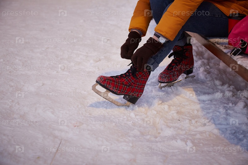Безликая женщина надевает коньки на ногу