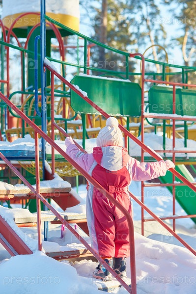 Ребенок играет на детской площадке в солнечный морозный зимний день