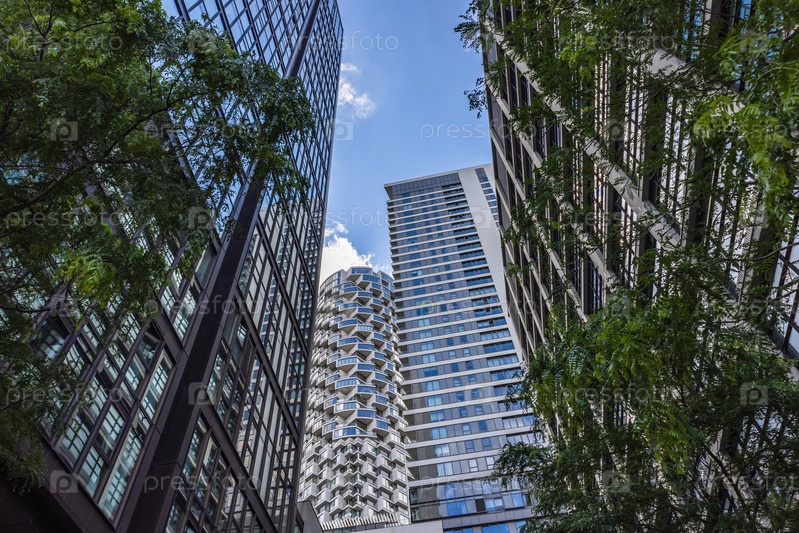Современные небоскребы и городские деревья. Потрясающая архитектура и вид на городской пейзаж