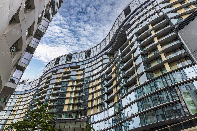 Современный жилой комплекс. Современная архитектура со стеклянными балконами в Лондоне