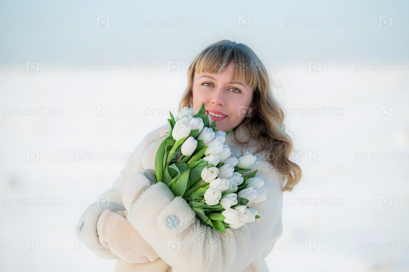 Красивая женщина на фоне зимнего пейзажа с букетом белых тюльпанов