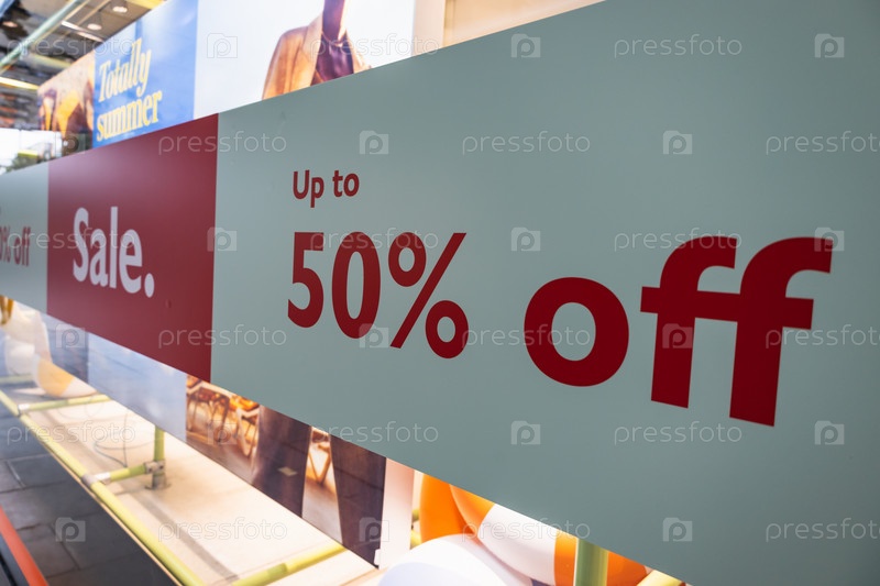 Большой баннер со скидкой до 50 процентов на витрине магазина