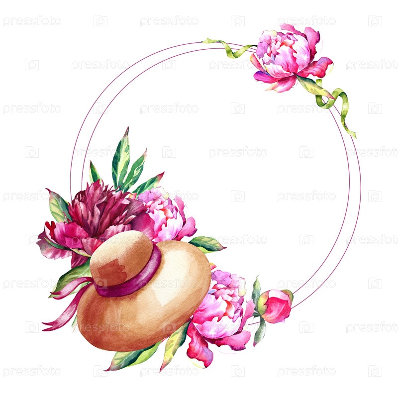 Цветочная круглая рамка с женской шляпой на белом фоне. Акварельная иллюстрация с розовыми пионами и бутонами, зелеными листьями и женским головным убором