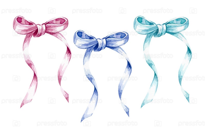 Набор цветных бантов на белом фоне. Тонкая лента. Акварельный рисунок. Элемент для оформления поздравительных открыток и приглашений