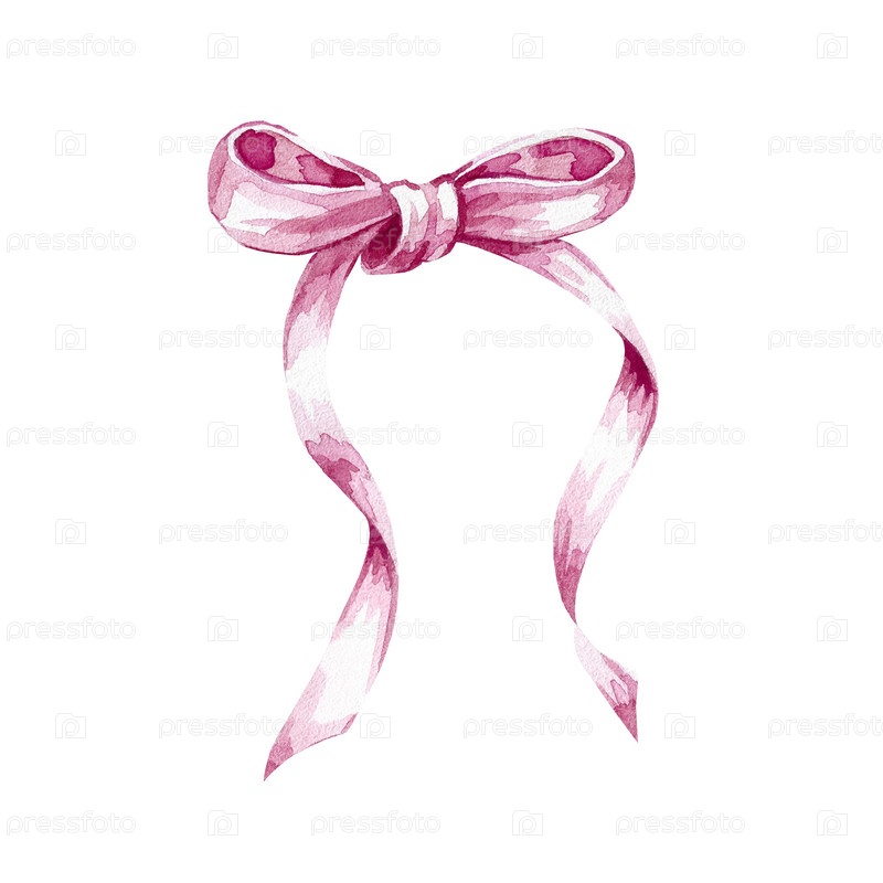 Розовый бант на белом фоне. Тонкая лента. Акварельная иллюстрация