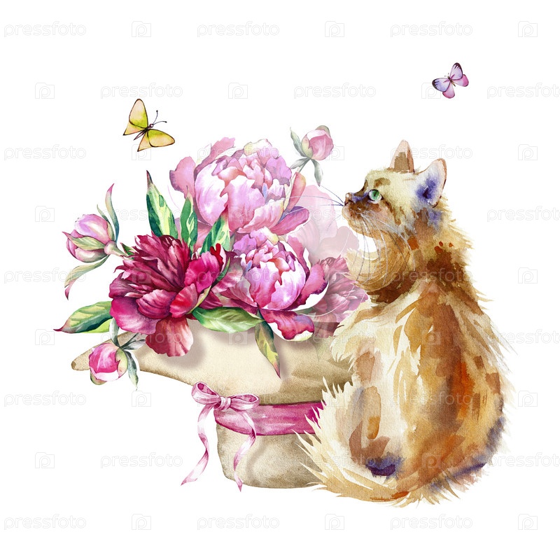 Законченная акварельная иллюстрация с пушистым рыжим котом, сидящим рядом с женской шляпой, наполненной букетом розовых пионов с зелеными листьями и летающими бабочками. Ботаническая иллюстрация. Для оформления поздравительных открыток, приглашений, визит