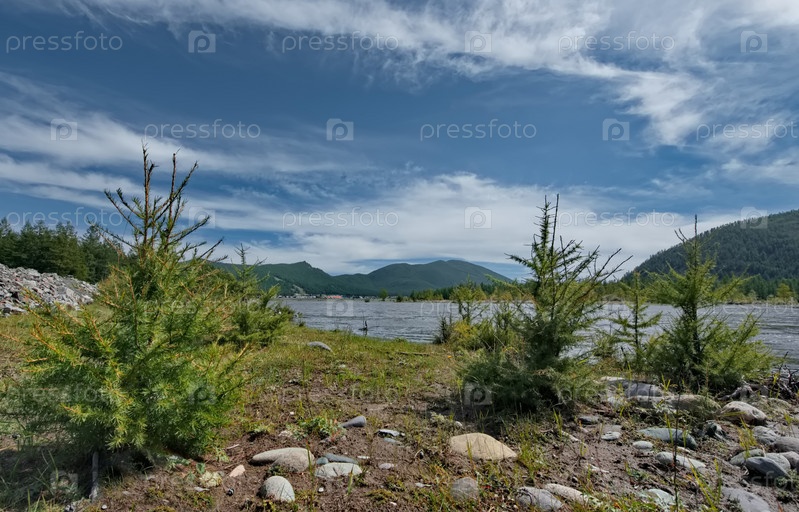 Россия. Республика Бурятия. Необычный вид на поросль молодых елей на самом краю берега реки Ока