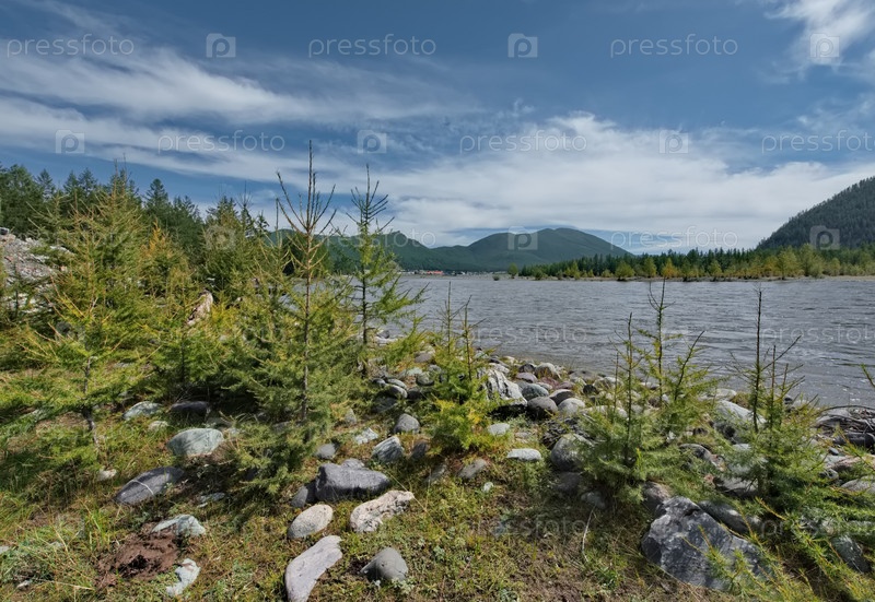 Россия. Республика Бурятия. Необычный вид на поросль молодых елей на самом краю берега реки Ока